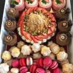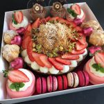 מארז קינוחים מגוון ומפנק הכולל: עוגת מוס שוקולד לבן ומסקרפונה תותים טריים וקדאיף, פחזניות קרם פטיסייר, מוס שוקולד פרלינה ונוגט, פבלובות תות וקרם וניל ומקרונים שוקולד חלב.