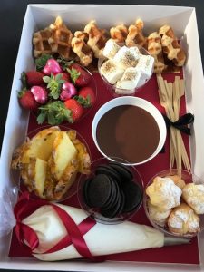 מארז פונדו רומנטי המארז כולל: פירות העונה, פחזניות קרם פטיסייר, וופל בלגי חם וקריספי, מרשמלו שרוף, עוגיות אוראו, מטבל שוקולד לבחירה מריר/ חלב/ לבן וקצפת וניל לפינוק..